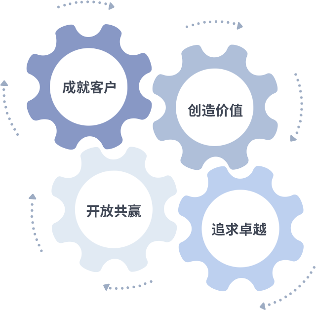 成就客户是一切决策的出发点,,,创造价值是衡量所有工作的标准,,,追求卓越是我们做事做人的态度,,,,开放共赢是我们的格局也是最终的结果。。价值观的齿轮环环相扣,,,,推动着组织里的每个人不断向前。。。